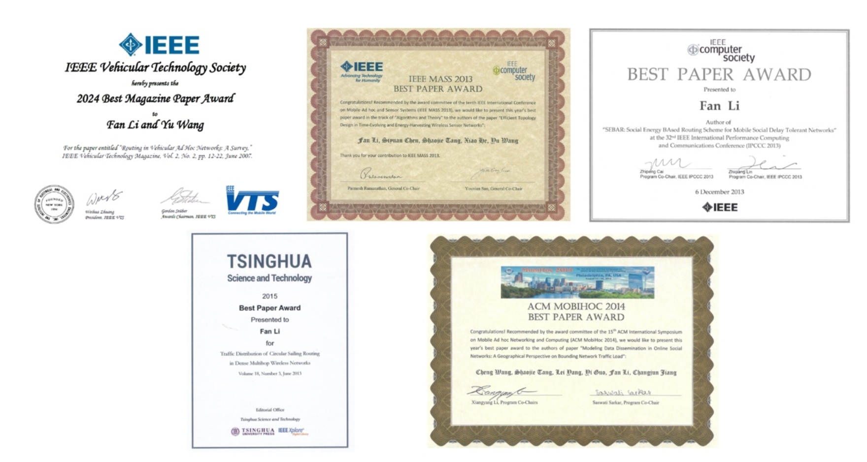 (2)IEEEMASS(国际移动自组织网络和传感器系统会议)2013最佳论文奖;