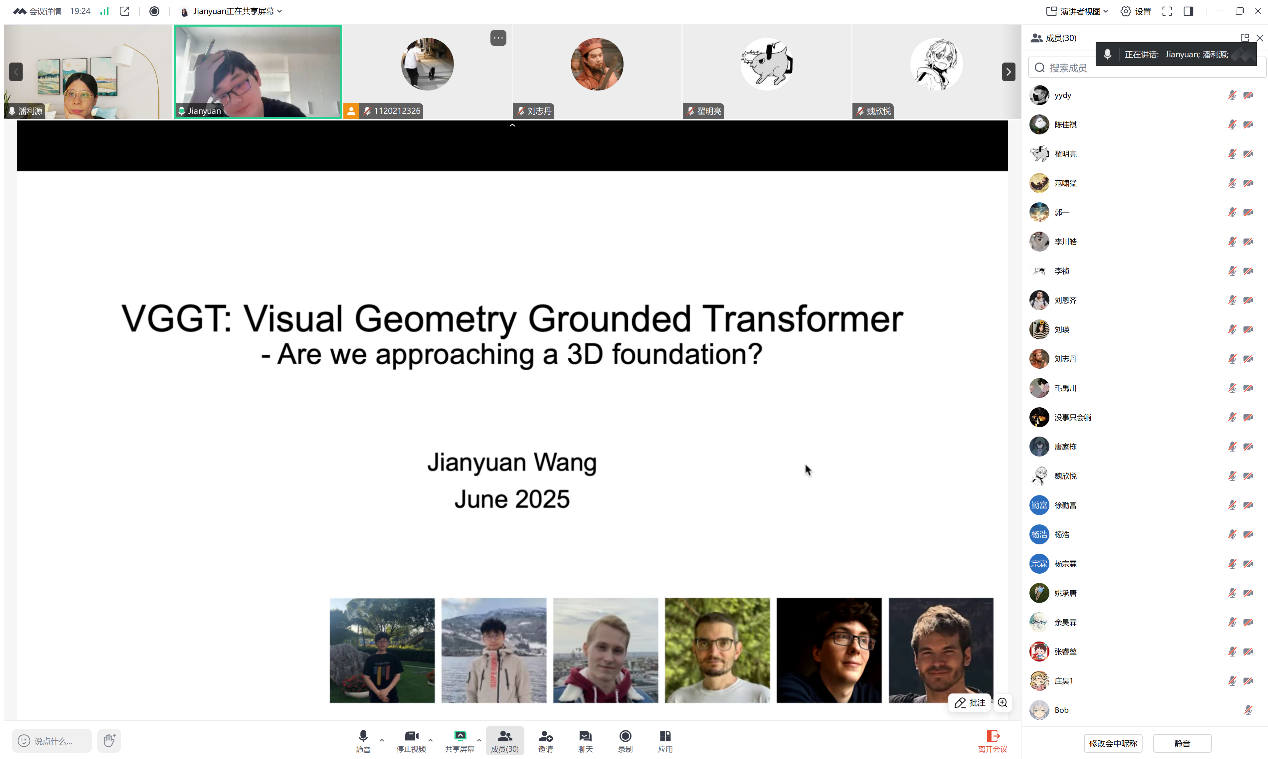 2025年6月4日,应qm球盟会网站潘利源和梁玮老师邀请,Meta AI研究员与牛津大学视觉几何组(VGG)的联合培养博士生王建元作题为“VGGT:Visual Geometry Grounded Transformer”的报告。此次报告由qm球盟会网站潘利源老师主持,图像计算与感知智能所相关研究方向教师和研究生参加了学术报告。