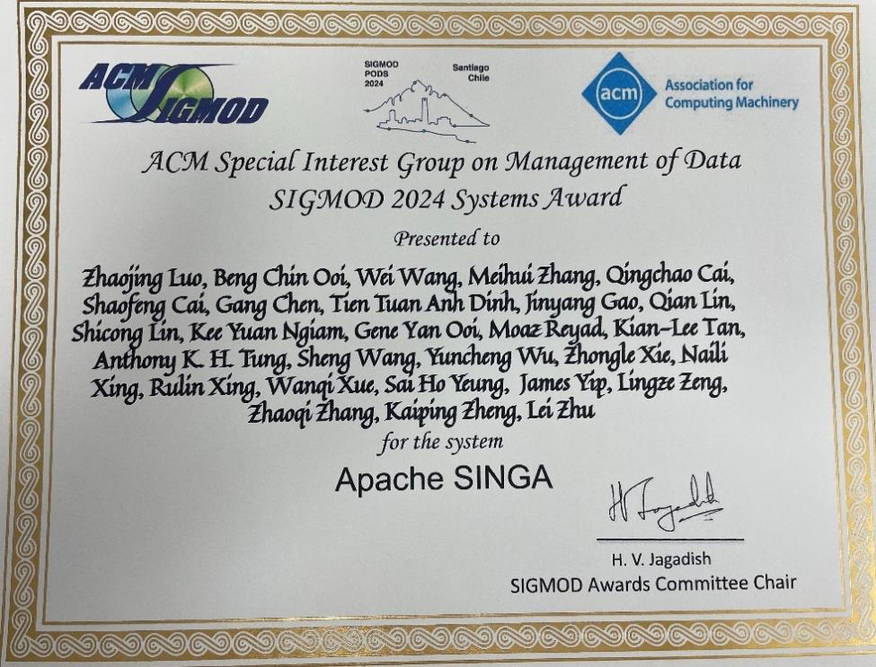 6月9日到6月15日于智利圣地亚哥召开的ACM SIGMOD 2024会议上,国际计算机学会(ACM)宣布将2024年ACM SIGMOD Systems Award授予Apache SINGA项目研发团队,以表彰其在研发分布式、高效、可扩展且易于使用的深度学习平台以用于大规模数据分析方面的贡献。主要获奖人员包括我校qm球盟会网站教授张美慧、罗兆经。