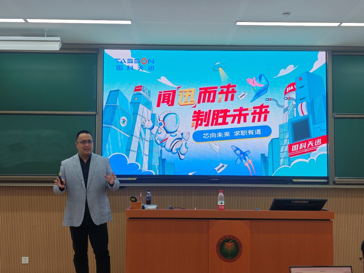 赵洋首先介绍了北京国科天迅科技股份有限公司紧随国家战略,实现高质量发展的发展历程,并从企业核心业务、业务布局、企业荣誉等方面进行了具体介绍。讲座中,他从如何感受一家公司的文化氛围和如何判断一家公司是否有适合自己的职业发展通道和路径两个问题出发,帮助同学们进行职业生涯规划,并在此基础上以莫入夕阳、紧随国运、职业兴趣、擦拭双眼四个要点与同学们分享应该如何选择求职方向。在求职技巧分享中,赵洋以优化简历为核心向大家做了一场内容翔实、干货满满的简历制作培训,以保持真诚、把握机会、呈现逻辑、日常积累、展示自我五个方面向同学们分享了面试技巧。